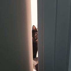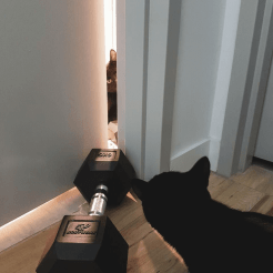Once home it was already late at night, so we kept them separated – Winnie was in the large bathroom with the door closed except for a tiny crack, and Nath roaming around the main house. We took a piece of cloth from Nathan’s bed and placed in the bathroom with Winnie and did the same with a piece of cloth from Winnie’s bed to try and get them used to each other’s scent. Nathan was not happy and even hissed at the cloth. Winnie continued her vocalisations and Nathan did intermittent rounds to assess the situation – this generally also resulted in them nose to nose through the small crack in the door and Nathan hissing. Nath set up camp for the night just outside the bathroom to ensure little Winnie wasn’t going to escape unnoticed.